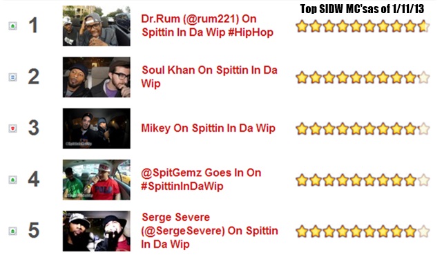 With the first full week of the new year now complete, now is the best time to get the weekly Spittin In Da Wip Chart reviews back in effect! So far this year I posted two new episodes that were actually recorded last year at the A3C festival in Atlanta. One of them (Dr.Rum) shot to the top of the Spittin In Da Wip charts within a few days and continue at the top all week, here’s the rundown. At #1 All The Way from The Netherlands is Dr. Rum who’s high energy, multiple styles and big following helped him dominate the charts this week. Next up is a oldie but good from 2011, Brown Bag Allstar member Soul Khan comes in at #2 and he’s been in the top 10 since we posted his episode. Coming in at #3 is 2012’s most voted and most weeks at the top of the charts in 2012, Long Islands own Mikey! Next at #4 is Spit Gemz who is 2012’s emcee of the year for his super solid performance, lyrical ability and multiple weeks at #1 and rounding out the top 5 is Portland Oregon emcee Serge Severe who also had a solid performance and endless bars.
