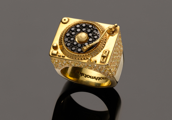 For all ya’ll ballers making big money off this HipHop thing, show your respect and love for HipHop and for the original jewelry of choice for the early HipHop heads…Gold!!! The folks at Mathmatiks made this dope 18k yellow gold with black diamond turntable ring with a rotating record top!!! It doesn’t get any more HipHop than that! But DAYUM $20,000.00 is a whole lot to be paying for a ring, I’ll have to wait for the fake gold line to come out….I’m a HipHop head on a shoe string budget lol, still a dope piece though.