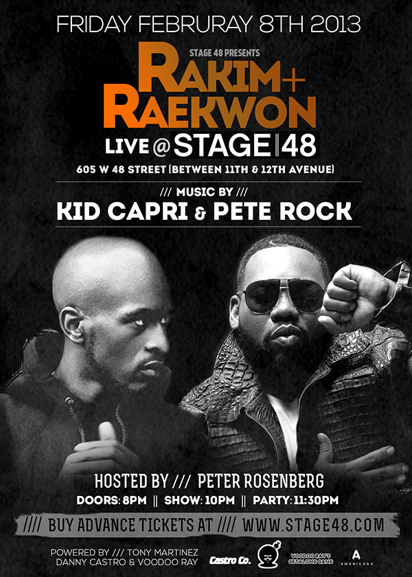 This Friday is gonna be off the chain when Raekwon And Rakim hit the stage at a dope new venue called Stage 48. On the 1 and 2’s Dj Peter Rosenberg Host of hot 97 morning Show and legendary Dj Kid Capri, this is an event you don’t wanna miss..Be There!