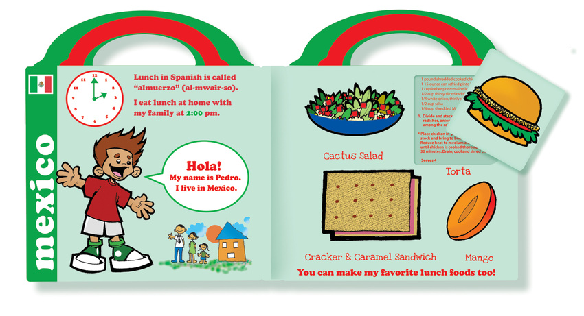Everybody Eats Lunch is a cookbook that encourages children to appreciate world culture while reinforcing healthy eating habits in a creative way. Each page features a different country, containing colorful removable images of the food to explore; underneath is a recipe for the dish featured. Younger children can play with the lunchbox-shaped book and foods, while older children learn layers of educational content such as social studies, geography, math, nutrition, languages, and telling time.