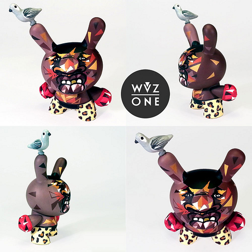 On my daily search for dope, hip, toys to share with ya’ll, I came across this cool custom called Mike “Pingeon Fancier” Tyson! It’s a commissioned piece that toy maker/artist WuzOne did for an englishman who is a boxing fan. The custom is a 3″ dunny 100% hand painted using spray paint, markers, acrylics, super sculpey and matt varnish. Peep the description WuzOne had for it