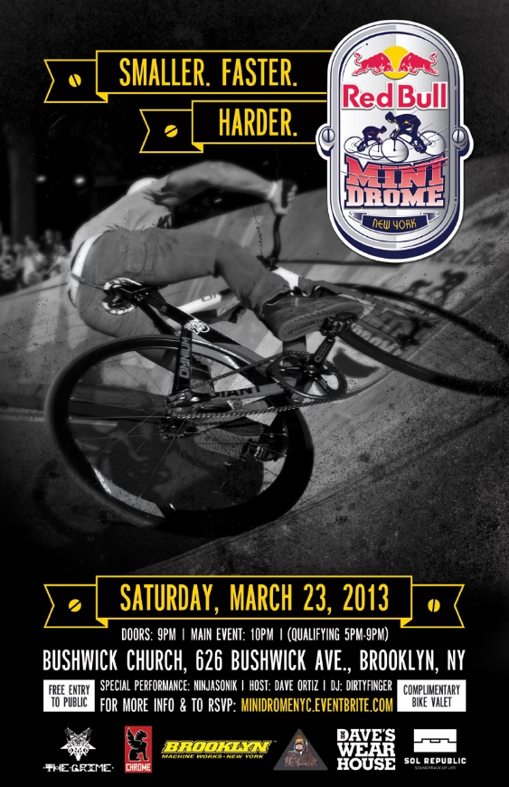 Since I’ve been following the fixed gear movement I’ve come across some really interesting freestyle videos and events. The upcoming Redbull Mini Drome comp seems like it’s gonna be a fun one to attend and cover (but I’ll be racing my BMX that weekend). So what’s the Redbull Mini Drome all about you ask? Peep the description below: