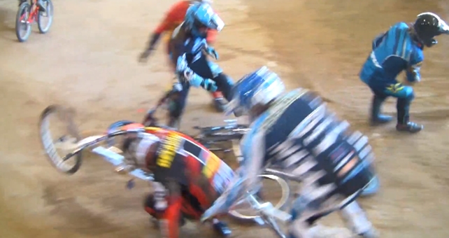 This crash was so crazy I had to put it in it’s own post lol! During the 41&Over Cruiser mains at the Redline Cup at Grippen BMX there was a huge pile up on that tight 2nd turn that left most of the rider scrambling for their bikes. I happened to be filming from that turn and got a close up view of the carnage. Check out the video below!
