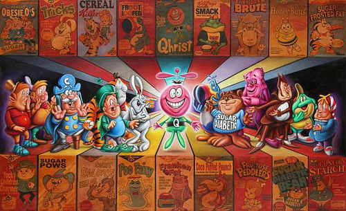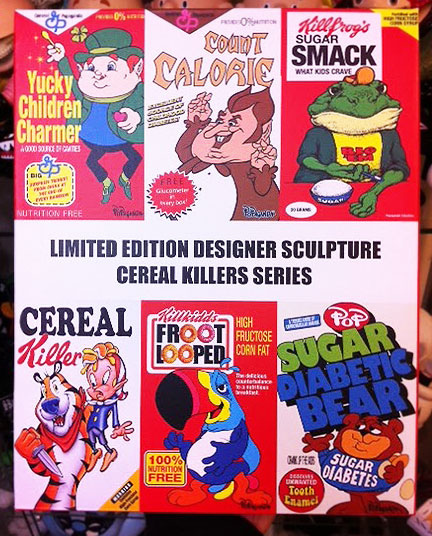 World famous, legendary artist Ron English did a parody illustration series called Cereal Killers which makes fun of the popular breakfast cereal boxes! Weather your a health nut or not you’ll get a kick out of some of the parodies like “Sugar Diabetic Bear”, “Fructose Peddlers” and “Obesie O’s” to name a few. Not only are these parodies funny, there also a message withing each piece..Comedy is one of the best way to get your point across for sure and Ron’s message is spot on!