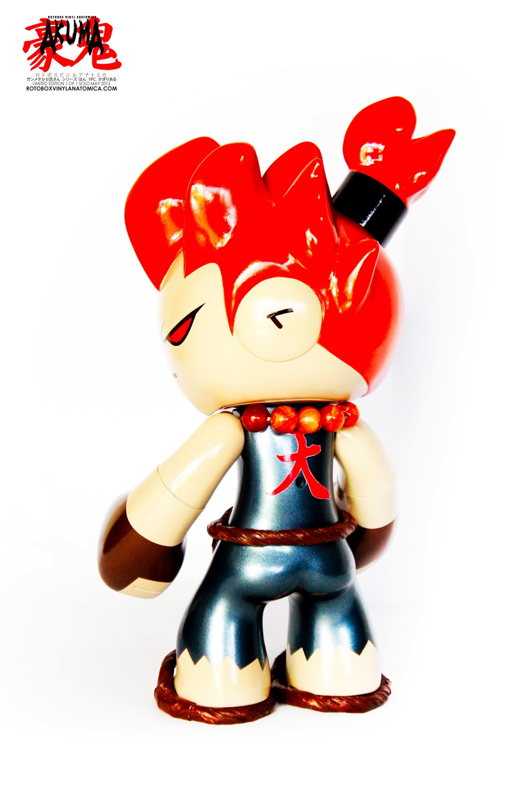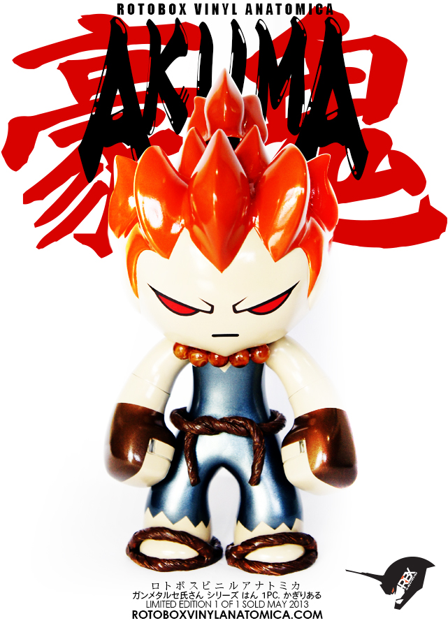As I delve deeper into the world of designer toys I keep finding some really dope customs! This one of a kind Celsius custom is of the Street Fighter character “Akuma” by Rotobox Vinyl Anatomica. This figure is off the chain!