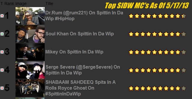 It’s been a while since I posted a Spittin In Da Wip Top Emcee’s update. Nothing much has really changed with the top 4 emcees on the chart Dr.Rum is in the #1 spot and has been sitting there for weeks, Soul Khan is at #2, Mikey is sitting at #3 and Serge Severe is staying at #4. But the big news of the day is the new entry at the #5 spot is none other that Shabaam Sahdeeq episode that we did in the Rolls Royce Ghost at the Dub Auto Show. Keep those votes coming!