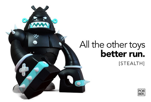 Graffic artist and custom toy designer Kronk just released his latest vinyl toy called Bad Ass, Stealth edition via Pobber Toys. This toys is pretty sick with it’s oversized fist, spikes and that dope matte black finish. Definitely a nice addition to a collectors war chest of custom toys! Below is the official press release for Bad Ass Stealth.