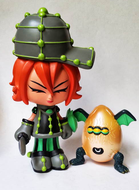 Queens custom toy designer Erick Scarecrow has got to be the hardest working toy designer in 2013! It seems like every other day he’s releasing a new piece lol. His latest piece called “Armora Edge” is a nice handmade 7″ resin figure which includes one 3″ Dragovo figure. The sword is removable in Armora’s hand. Each figure is signed and numbered. You can order a set for yourself here