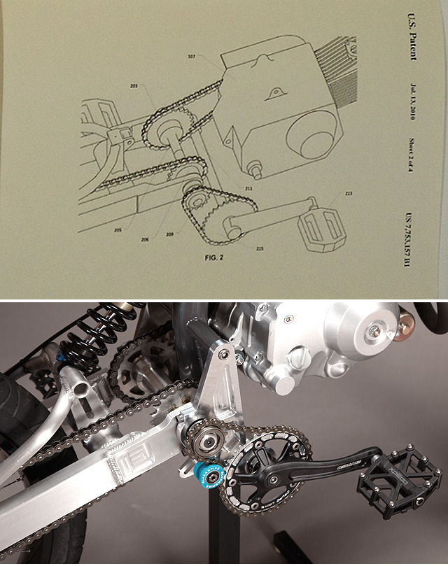 There’s also a footpedal brake assembly that converts a mountain bike hand brake into a foot pedal brake. This will allow a larger motor with a manual clutch to be run in the motoped, How dope is that.