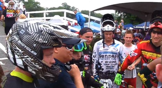On day 2 of the USABMX/UCI Stars N Stripes Nationals, the rain was started coming down hard during the last round of motos just before the quarter finals. As we all know the Pros and UCI decided not to race their mains. Here’s a little behind the scenes footage from when they were deciding to race or not. Featured in this clip are AA Pro Dennison Smith, Dani George and a cameo from Jagur.