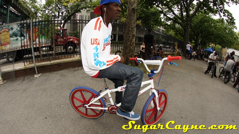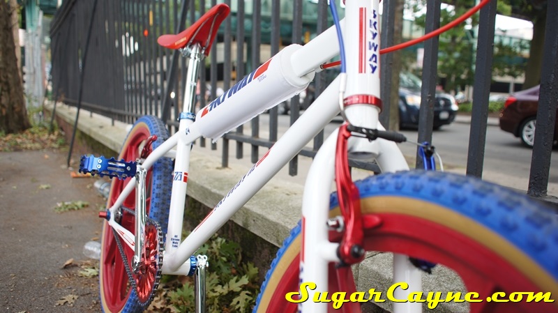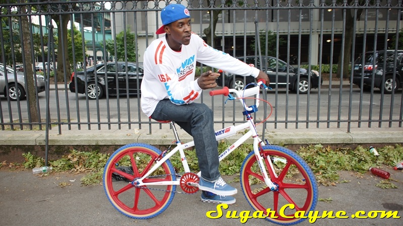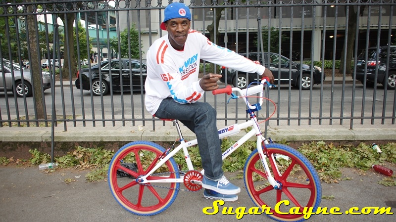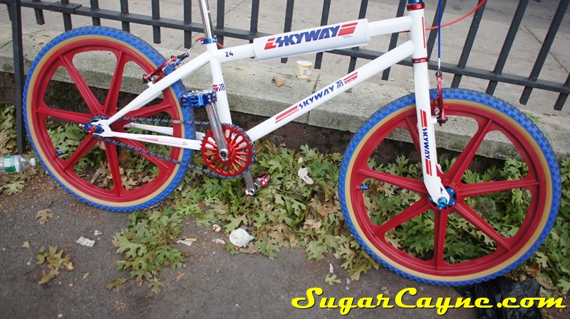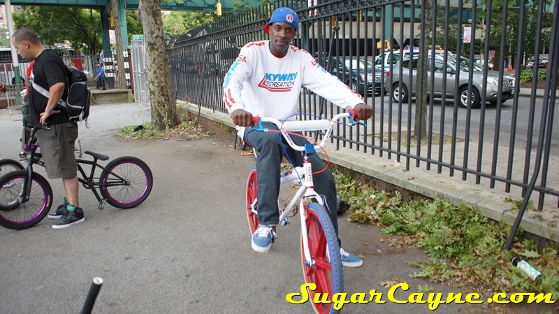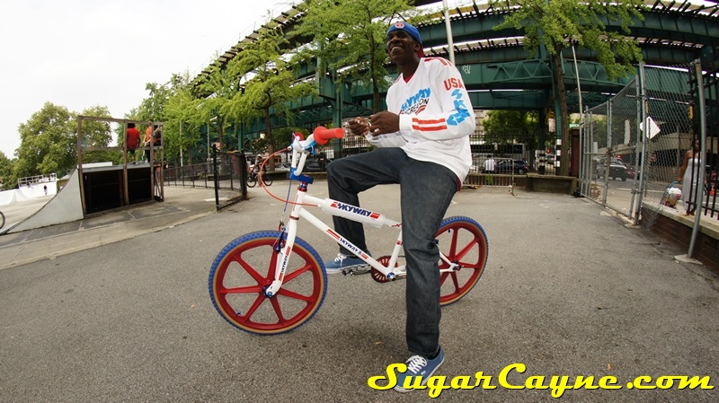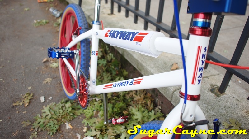 When I went to the Mullaly Get It Together Jam 2 recently there was a rider there with a really dope white 2012 Skyway T/A with red, and blue components. He was also rocking the Skyway Team Jersey so you know I had to take some pictures of his dope setup and introduce myself. The riders name is DJ Thoro and he’s one of NYC’s top DJ’s who has DJ’s for HipHop heavy weights Raekwon, 50Cent and Cassidy, he’s also a DJ on Shade 45, G-Unit Radio and 101.7 Kiss in DE! But before all of that DJ Thoro was one of the country’s top flatland freestylers…back in the AFA days!! All ya’ll OS BMXers might know him by Darryl Johnson. Here’s a clip of him back in the day: