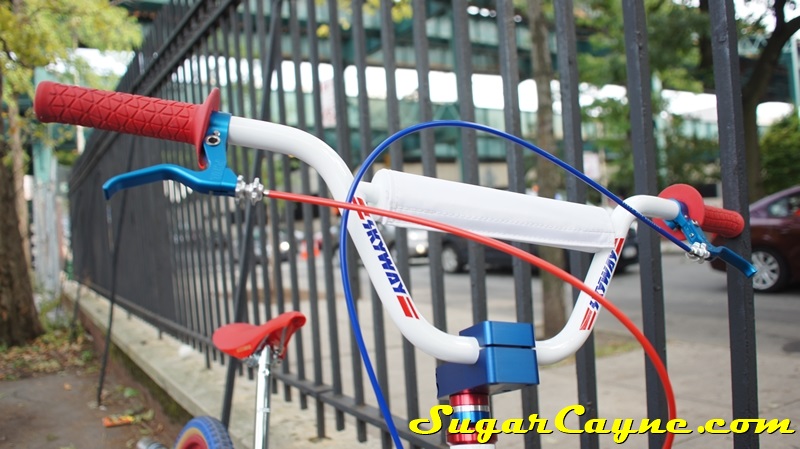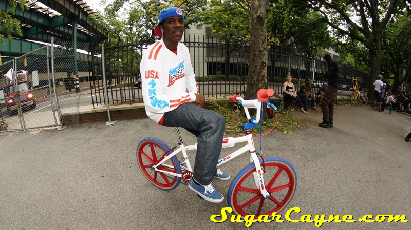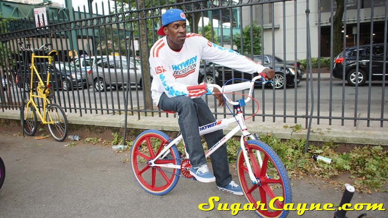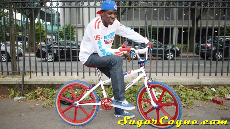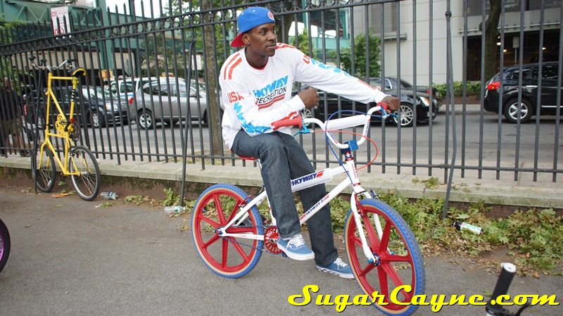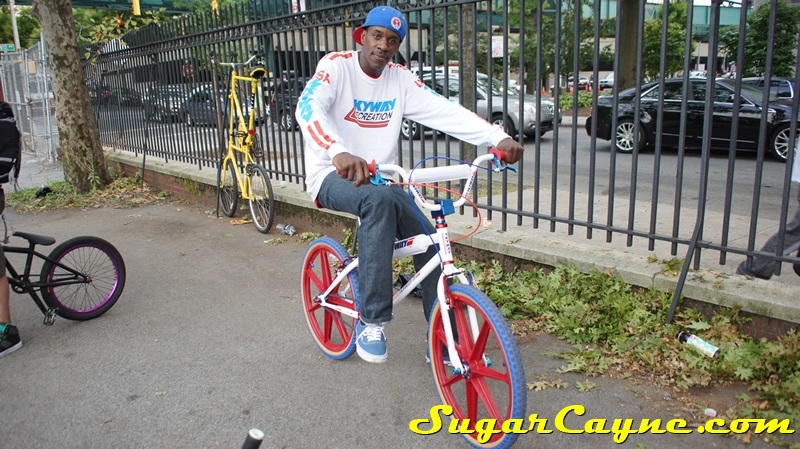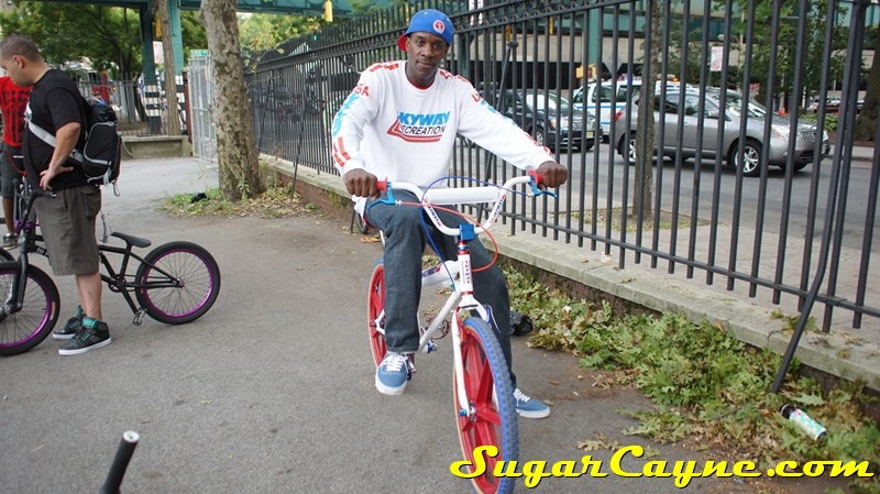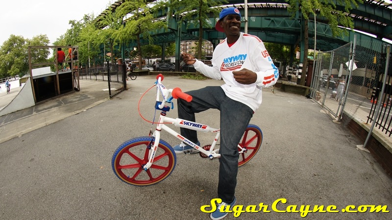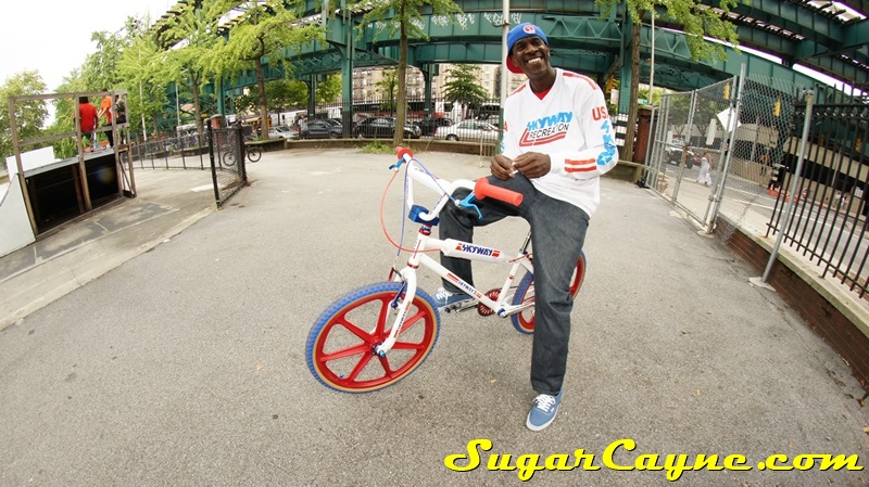 When I went to the Mullaly Get It Together Jam 2 recently there was a rider there with a really dope white 2012 Skyway T/A with red, and blue components. He was also rocking the Skyway Team Jersey so you know I had to take some pictures of his dope setup and introduce myself. The riders name is DJ Thoro and he’s one of NYC’s top DJ’s who has DJ’s for HipHop heavy weights Raekwon, 50Cent and Cassidy, he’s also a DJ on Shade 45, G-Unit Radio and 101.7 Kiss in DE! But before all of that DJ Thoro was one of the country’s top flatland freestylers…back in the AFA days!! All ya’ll OS BMXers might know him by Darryl Johnson. Here’s a clip of him back in the day: