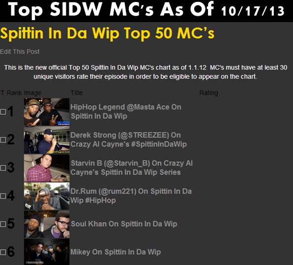 We got some new entries to the Spittin In Da Wip top 50 MC’s chart! Derek Strong who was recently on the show down at A3C entered the chart in #2 spot and Starvin B entered at #3! They knocked everyone else down two spots with Dr Rum moving down from #2 to #4 and Soul Khan from #3 to #5.