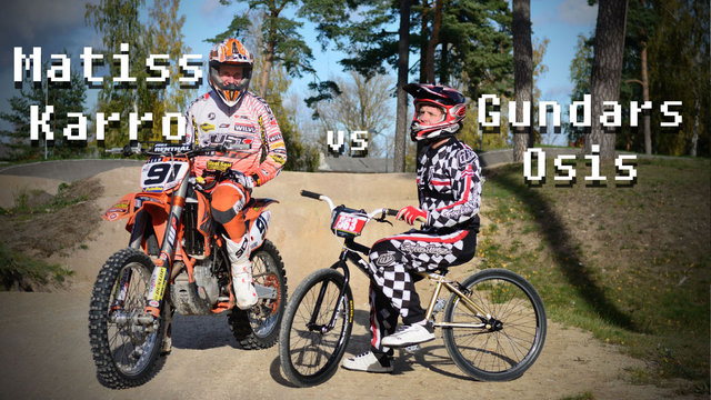 BMXer Gundars Osis and MXer Matiss Karro made this super cool video of them on their bikes battling it out on a BMX track! That’s right Matiss Karro rode his KTM motocross bike against Gundars on his BMX cruiser. Now at first the BMXer in me who hates when MXers destroy local BMX trails with their bikes was thinking “Dude is gonna destroy the track, this is blasphemy!!” But as someone who loves cool stuff I was excited to see the video and I was very curious to see how the MX bike would handle (or destroy) the BMX track lol 🙂