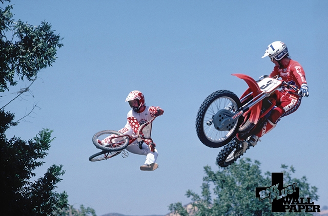 This video reminds of that BMX/MX photo shoot in BMX Plus back in the 80’s but that was a little different. In the 80’s BMX Plus photo shoot they were at the trails, I believe it was actually some motocross trails but in this new one I believe it’s the first time there’s been a mash up with a BMX and Motocross bike on BMX track!