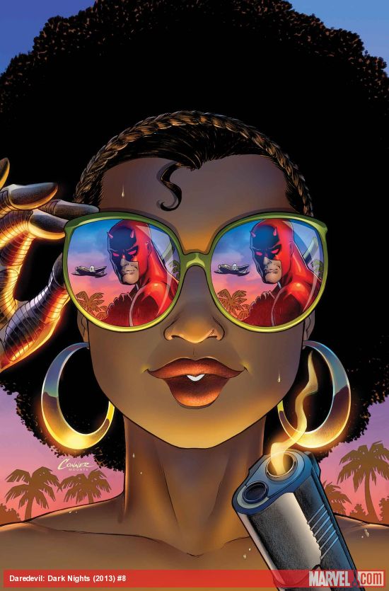 I spotted this cover for Daredevil: Dark Nights, issue #6 featuring Misty Knight on GhettoManga.com. The cover illustrated by Amanda Connor and Paul Mounts looks like it could be an illustration from the GTA series or a Black exploitation movie poster. The whole subliminal play on words “Dark Nights”(Misty Knight who happens to be black, hence the title Dark Knights? Come on sun!!), half naked sister and old school dialog doesn’t really sit right with me. I don’t get gassed when Marvel decides to feature people of color in their comics just because it’s Marvel. Now I’m sure Misty Knight probably kicks ass in the comic but does every sister in the media have to be stereotyped or objectified, etc? Anyways I digress, let me jump off my soap box, enjoy The art work and actually check out the series lol. But ya’ll know what I’ talking about!