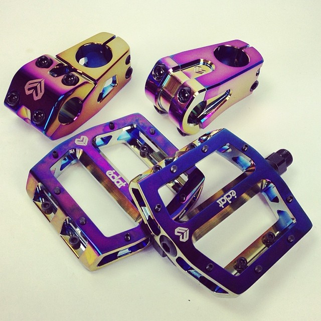 I been meaning to post this promo pic of these new Eclat parts with this super dope shinny purple/chrome oil spill looking paint job for a few day now. I forgot what the actual color is called but it looks amazing. I don’t remember who’s facebook page I saw this on and I didn’t see them when I searched on the Eclat website. All I know is these parts look amazing, that coloway is sick and I’m guess their coming soon. Visit EclatBMX.com for more info and updates