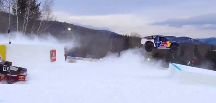 Red Bull is always producing amazing extreme sports events with their signature series. Their latest awesome event is the Frozen Rush! Basically they took the modified dirt/baja pickup trucks and made then race on a snow course for some dope winter racing action. It wasn’t all little hills and sharp turns, they had a huge jump on the track too. This looks like so much fun!!