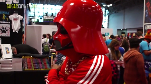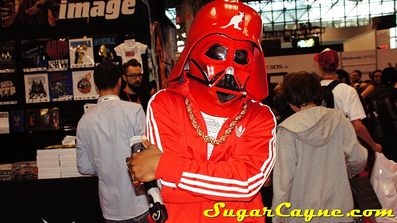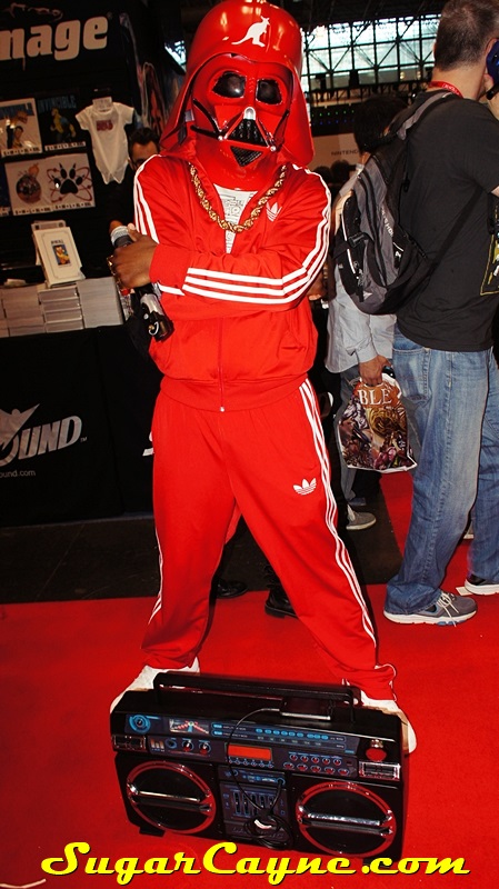 One of my favorite Cosplay costumes of 2013 was the HipHop Darth Vader I saw at the New York Comic Con. This guy had the Darth Vader helmet painted in all red with an all red Addias outfit, Boom Box, Mic, dookie gold chain and white and black shell toe Addias sneakers. The HipHop Darth Vader looked like he could’ve been the 4th member to Run DMC lol. But it was a big let down when I asked him if he had rhymes and he said no…Booo!