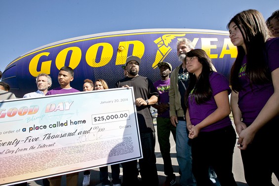 “Today Was A Good Day” indeed for HipHop Legend, Actor and Director Ice Cube! In one of the perfect examples of art imitating life or is that life imitating art, 20+ years after the release of “It Was A Good Day” Ice Cube finally got his name lit up on the Good Year Blimp! The tribute was in recognition of National Good Day Day, a Good Year blimp with the rapper and actor’s name flew over South Central, L.A. and I guess I’ll jump on the band wagon and say, No the Blimp didn’t flash the lyrics, “Ice Cube’s A Pimp” 😉 . The National Good Day Day project raised $25,000 for the nonprofit organization, A Place Called Home, it really was a good day! Salute to Ice cube!
