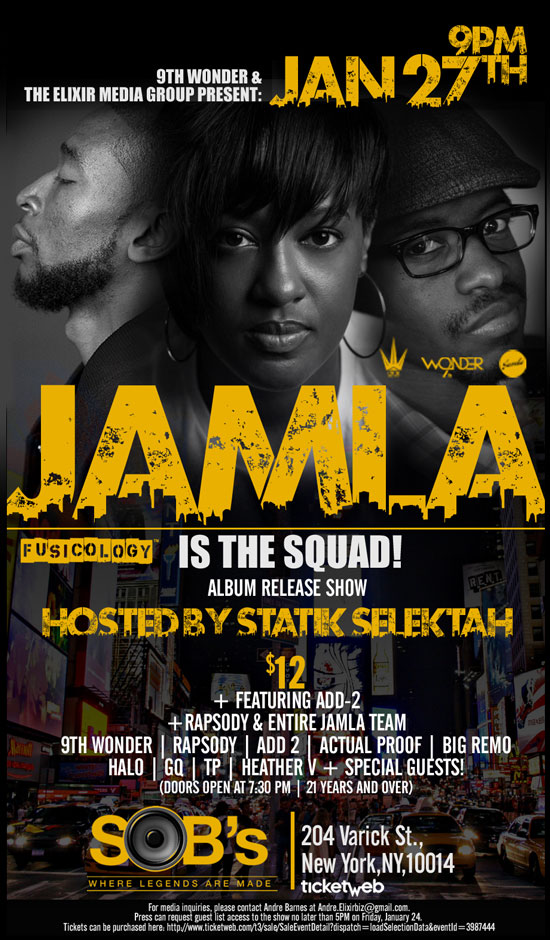 9th Wonder is bringing the whole Jamla Records Crew for a night of HipHop Dopeness at the Legendary SOB’s this Monday, Jan 27th! The Jamla Records crew is celebrating the release of the forthcoming “Jamla is the Squad” compilation album with live performances by the entire team, including Rapsody, Add-2, Actual Proof, and a few very special guests. The event will be hosted by super producer/DJ Statik Selektah, ya’ll don’t wanna miss this one!