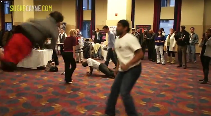 One of the many cool things that went down at the 1st annual Urban Action Showcase were these random live martial arts action scenes performed on the showroom floor. In this clip two young kids beat up some big thugs.