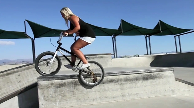 18 year old BMXer Perris Benegas shows us how she get’s down on her BMX bike at the parks…in short shorts lol!!! After a few clips of some nasty bails Perris flows and grinds the Reno, Nevada parks up with style and she was boosting some big air over the quarter and rezy. Watching her got me amp’d and ride and even step up my game and throw some pegs on my bike lol! It’s always awesome to see the ladies shredding, this is BMX Dopeness 4sho!!