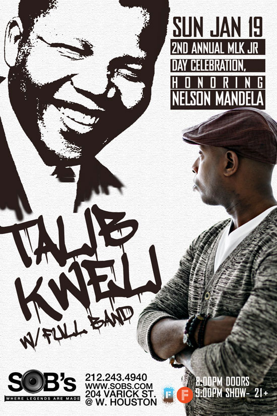 SUNDAY, JANUARY 19TH at world famous SOBS in New York Talib Kweli will be headlining the special, Martin Luther King Jr Celebration Honoring Nelson Mandela! This is gonna be a great event, get your tickets now before it’s sold out!