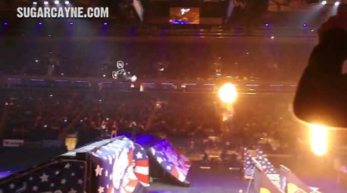 The insanity continued at the Nitro Circus NYC show at Madison Square Garden with this sick back flip/triple tail whip big air. He was so close to pulling this off!