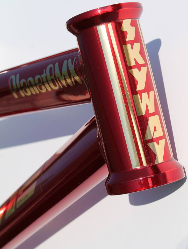 Skyway BMX and Planet BMX continue to do some really cool things together! Their latest release is the new candy chorme red and blue colorway’s for the Skyway T/A’s. These awsome translucent colorways look great on the T/A and gold decals are a really nice touch! I would love to see these bikes come with white decals too that would be awesome!