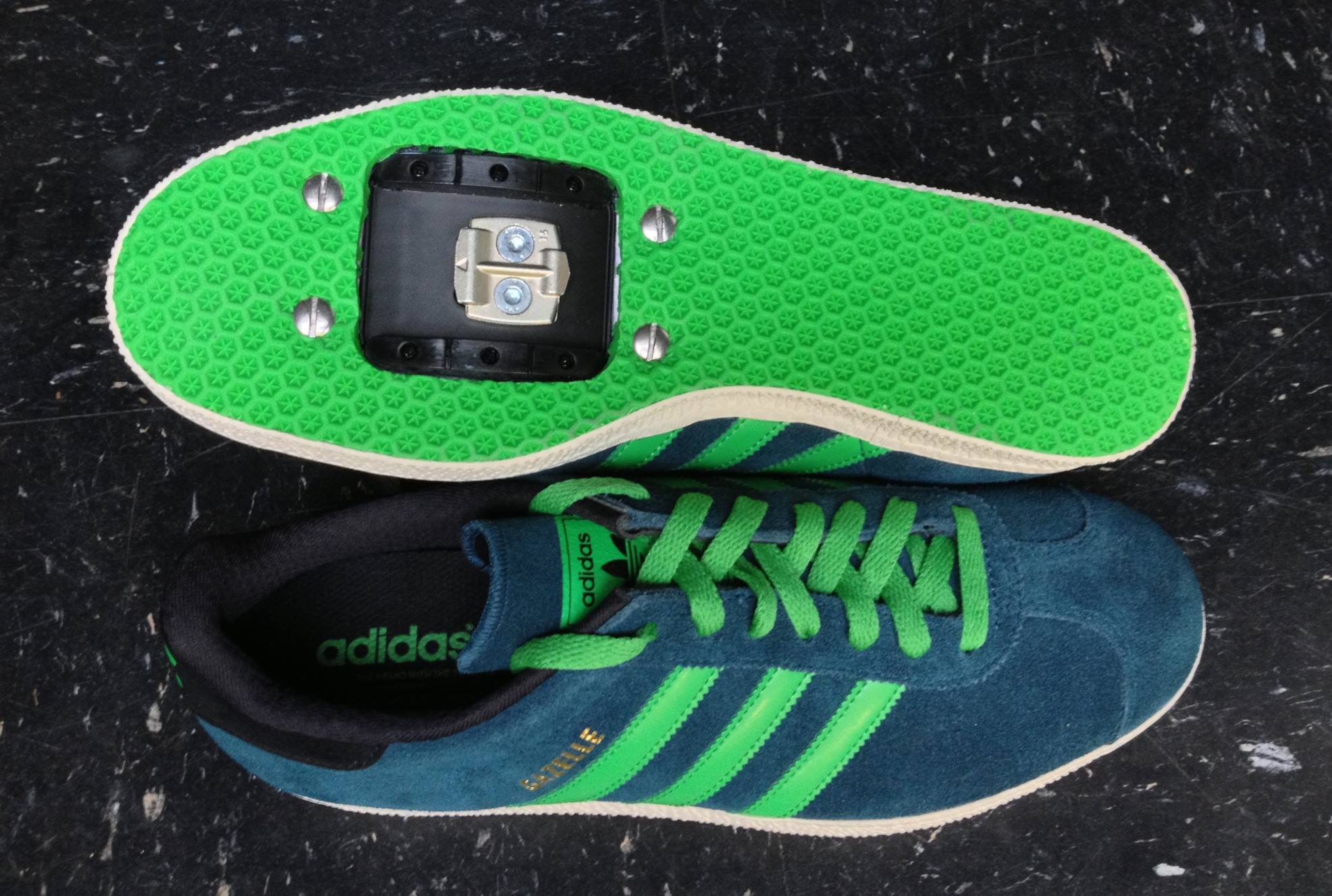 I got tagged on a photos of these Adidas Gazelle’s with a clipless cleat and I thought Adidas was actually making some cool cycling shoes. But after a little diggin it turns out that there’s a Santa Cruz based company called RetroFitz that makes custom clipless adapters for any sneaker or shoe! It’s funny because I was recently talking about BMX Racing shoe sponsors and someone brought up how clips ruined that sponsorship avenue for BMX racers. The Retrofitz adaptors could help be a game changer when it comes to shoe sponsorship’s in BMX racing. Now you can take any kicks you want and have RetroFitz make one for your or you can purchase their DIY kit and do it yourself. Basically now the sky’s the limit for all you die hard clipped in BMX racers that are looking for more sponsorship or footwear style options. I guess now the question is, how do they perform in BMX racing conditions.