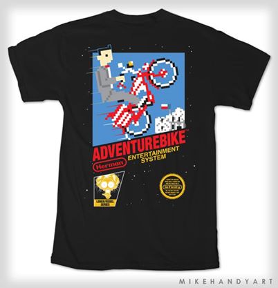This new mash up spoof t-shirt of Pee Wee Herman on his beloved bike and Nintendo’s classic video game Excite bike is one of the best T-shirts of 2014 hands down! “Adventure Bike” by Mike Handy Art puts Pee Wee and his bike as the pixelated image in place of Nintendo’s motocross rider spoofing the Excite bike image with Pee Wee’s Big Adventure movie. I love the “Loaner/Rebel Series” icon lol! This is so cool!