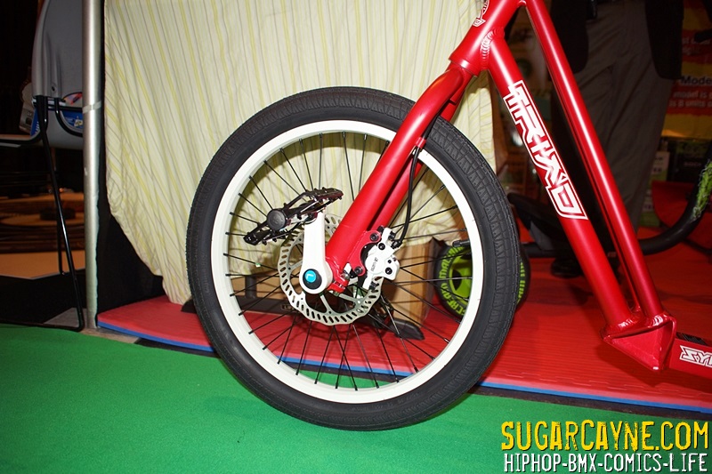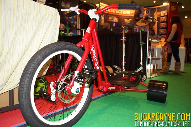 I’ve been watching the high end big wheel movement online for a while now and I finally got to see one up close at Toy Fair NY! Australian based performance drift trike company Triad had their “Syndicate” trike at a distributors booth.The trike looks awesome, I was loving that matte red finish on the frame. Syndicate look like it’s built to perform for real and you can tell the front end uses BMX and MTB technology, I’m diggin that. The Triad trikes are made for high speed drifting down hills and the Syndicate comes with disk brakes for some legit stopping power but their other models come with 990 style brakes also the front wheel is 20″…..I love how it all comes back to BMX 😉