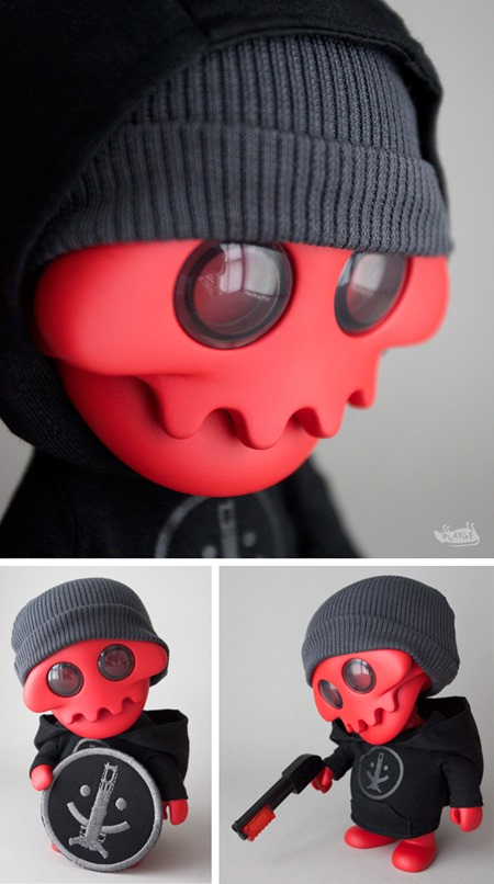 I spotted this dope toy on VinylPulse.com and had to share it with ya’ll!! This cool piece is done by Ferg for the Rotofugi booth at the upcoming San Diego Comic Con. I was never into skulls or skeleton looking toys but throw a hoodie, shotty and skully on the piece then your talking my language lol! I also like the colorway with the red, black and grey, I’m diggin this piece!!