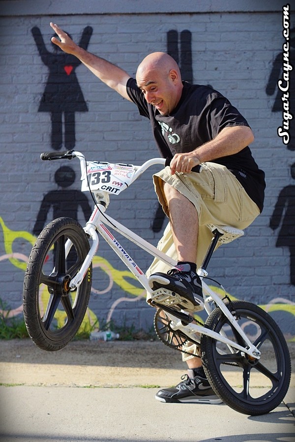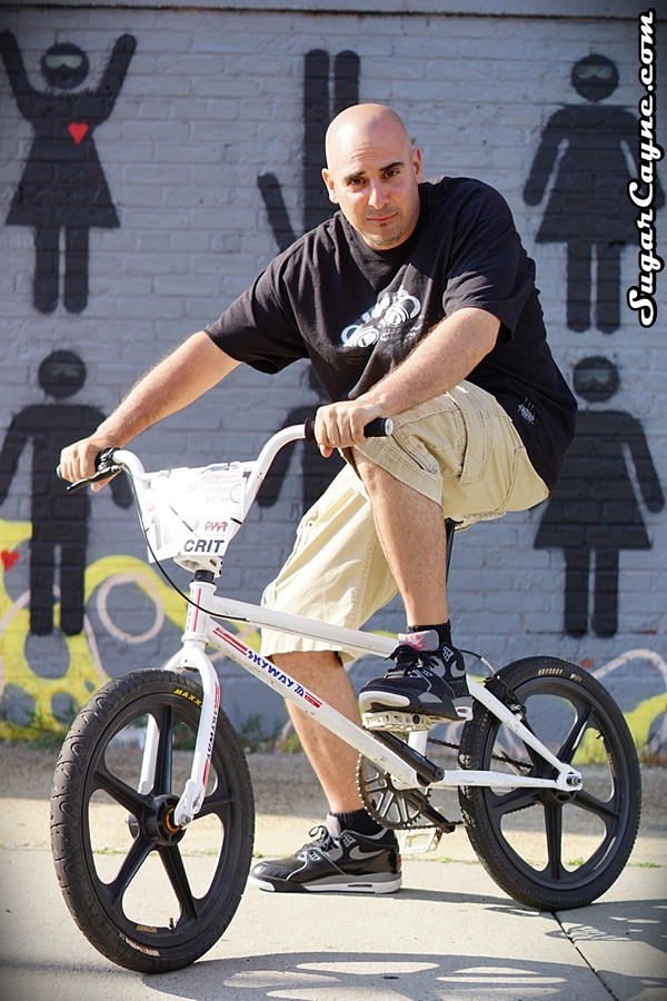 Emcee/Producer/DJ M-Tri took a few pictures on my 2013 Skyway T/A while we were on the set of the “Trading Places” video shoot. M-Tri is nice with the tricks on the bike lol 😉 What I really like about this photo is it captures 3 of the elements of SugarCayne.com, HipHop, BMX and art.