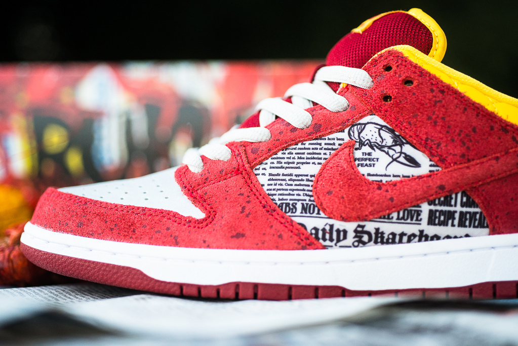 The creative folks at Rukus is bringing the food of Louisiana in to the world of footwear with its new Nike SB Dunk Low QS “Crawfish” Kicks!! These fly kicks represent a visual of a Louisiana staple, the crawfish boil! The “Crawfish” is wrapped with red speckled suede overlays representing the main ingredient crawfish. Supa dope premium quilted yellow leather which represents the corn, a silver leather toe represents the pots used to cook all that Louisiana Crawfish goodness up. And finally, there is newspaper print used on the midfoot panels, now this suppose to represents the tablecloths that the crawfish and corn are usually served on. This is the first time I’ve seen a food inspired pair of kicks, this is a dope concept and the sneakers look great! You’ll be able to grab these Dunk Low QS “Crawfish” exclusively at Rukus on Saturday, August 16….why am I hungry all the sudden… 😉