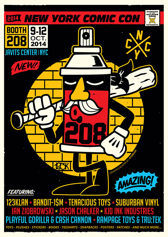 NYCCÂ is October 9-12 at the Javits Center in NYC. Our Booth #208 is a block of 6 regular-sized booths, smashed together in the middle of the part of NYCC known as “The Block“… join our loose association of ne’er-do-wells, toy hustlers and original villains as we dump a tidal wave of toy and street art all over New York Comic Con!