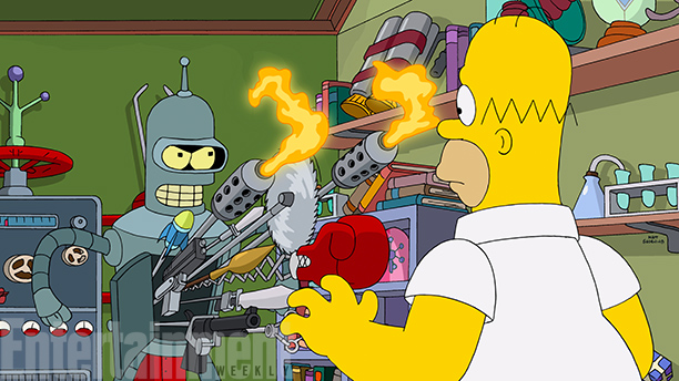 You probably already know of the upcoming Family Guy/ The Simpsons crossover episode(Airing Sept 28th) but did you know that the crew from Futurama will be crossing over into Springfield as well?! Yep it’s official the re-canceled Futurama will join Homer and his peeps for a special Simpsons episode called “Simpsorama”! The tagline of the episode reads, “A show out of ideas teams up with a show out of episodes.” lol! Fox released a few images from the crossover and the episode will air on November 9th, you know I can’t wait for this!!!