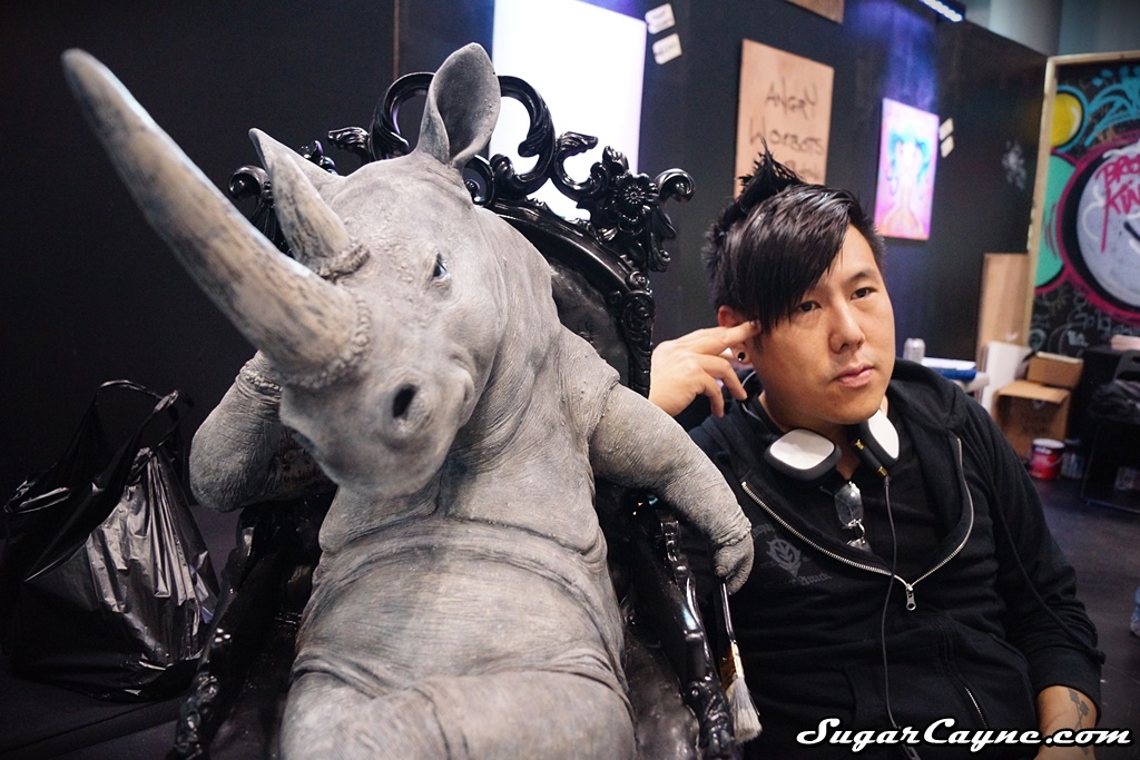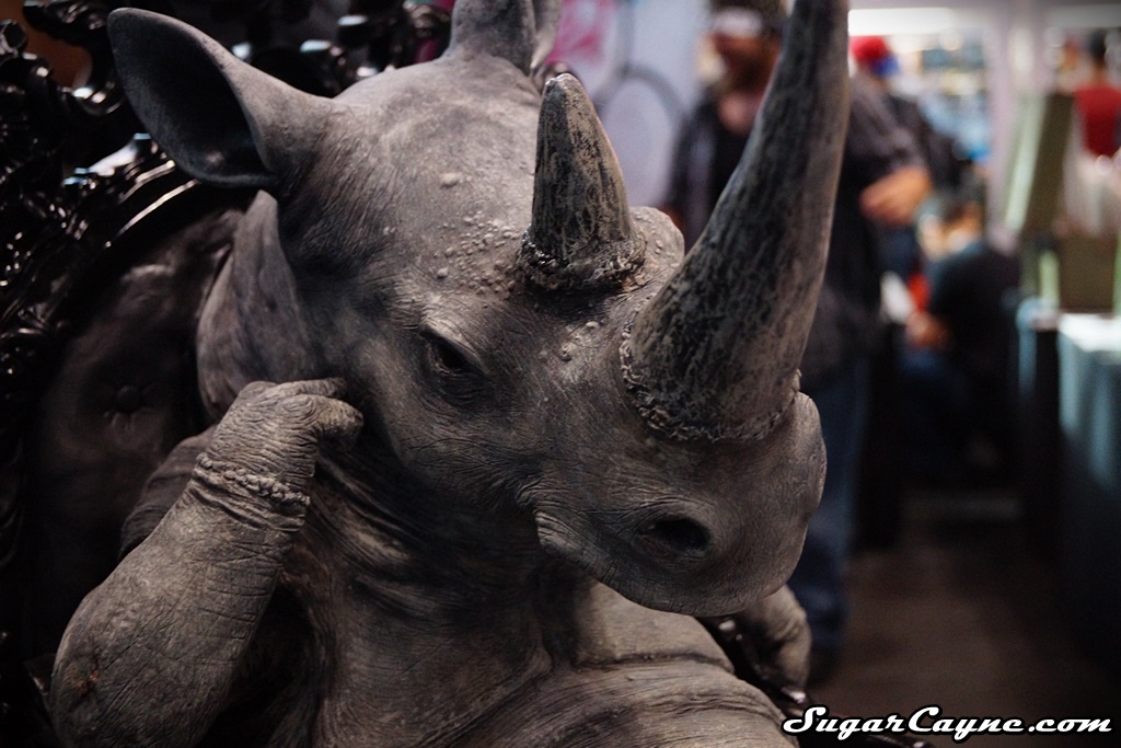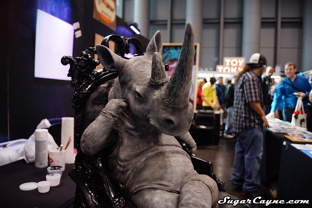 Super talented sculptor J-RYU came to the New York Comic Con with his awesome piece called “The Scribe”. It’s a huge 40 pound sculpture of a wise Rhino in deep thought. As soon as I saw this piece I had to get a quick interview with J-RYU. He was part of the Art Whino mega booth in “The Block” section of the event. I always look forward to checking out the Art Whino booth at the NYCC.