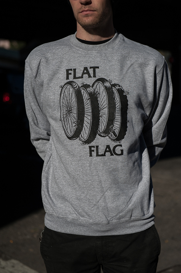 King Kog recently dropped a new crew neck parody design of the infamous Black Flag logo and flipped it to “Flat Flag.” This Kyler Martz design features a font similar to the one used in the Black Flag logo. It also features four bicycle wheels with flat tires caused by nails pins and even a screwdriver lol, Nice!