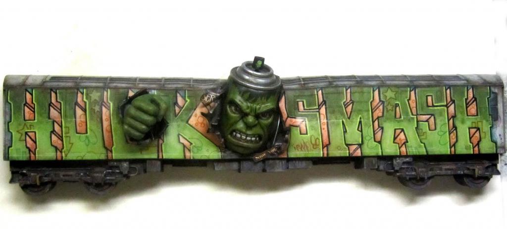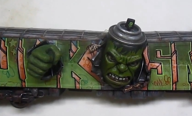 Mike “NemO” Mendez released this image of his custom rendition of the popular All City Style Blank DIY Train. He turned it into a HipHop/comic masterpiece called “Hulk Smash”! “Hulk Smash” features resin sculpted elements to create the Hulk’s face busting out of the train plus some really dope graffiti lettering along the whole trian. I also like that he sculpted the Hulk as a spray paint can to bring it full circle. Really dope piece!!