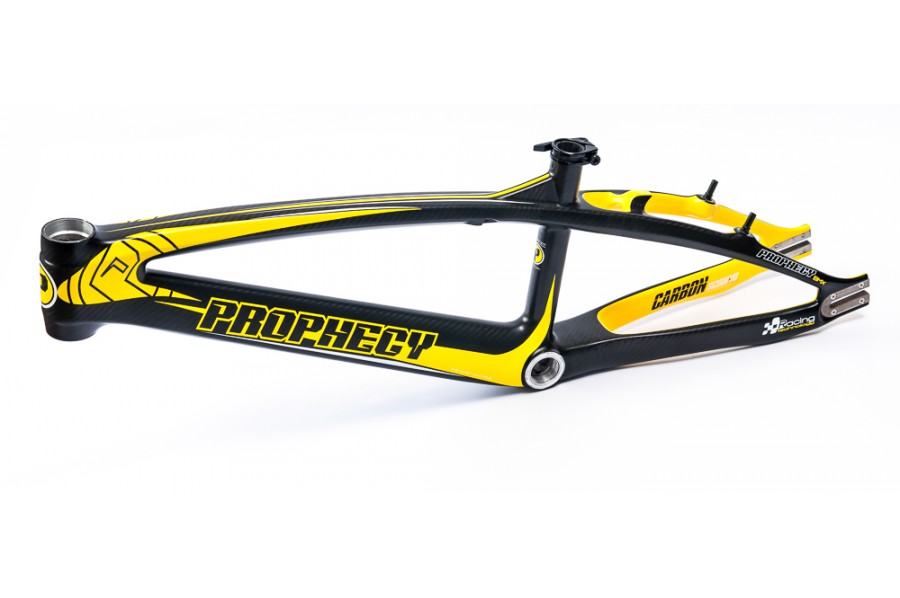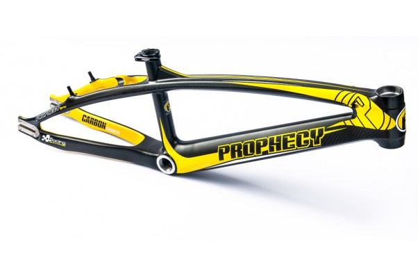 I’m loving that colorway of the the limited edition Prophecy SCUD EVO carbon fiber BMX race frame! The Yellow and carbon/charcoal grey colorway looks sick and I really like the way they used the yellow on the inner side of the rear triangle(Seat & Chain stays).