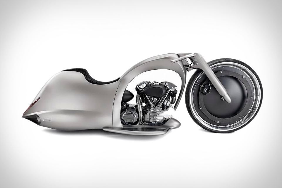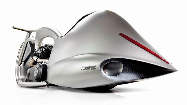 The “Full Moon” Concept Motorcycle by Slovenian exhaust pioneers Akrapovič looks sick! This unique, future/retro looking work of art taks its name from the large aluminum and carbon thirty-inch wheel on it. I love how the entire rear wheel is covered and that rear end looks mean. The engine looks like it’s not attached to anything just the base of the chassis. The the contious, seamless flow from the stem to the rear of the bike is so cool. It took over eight hundred hours of work to get this bad boy together….DAM!! Some of it’s features are an S&S Knucklehead 1,524 cc engine and two modified custom-made Akrapovič exhausts. The body and frame are made entirely of sheet metal and is an extension of the exhaust system. I want one!!