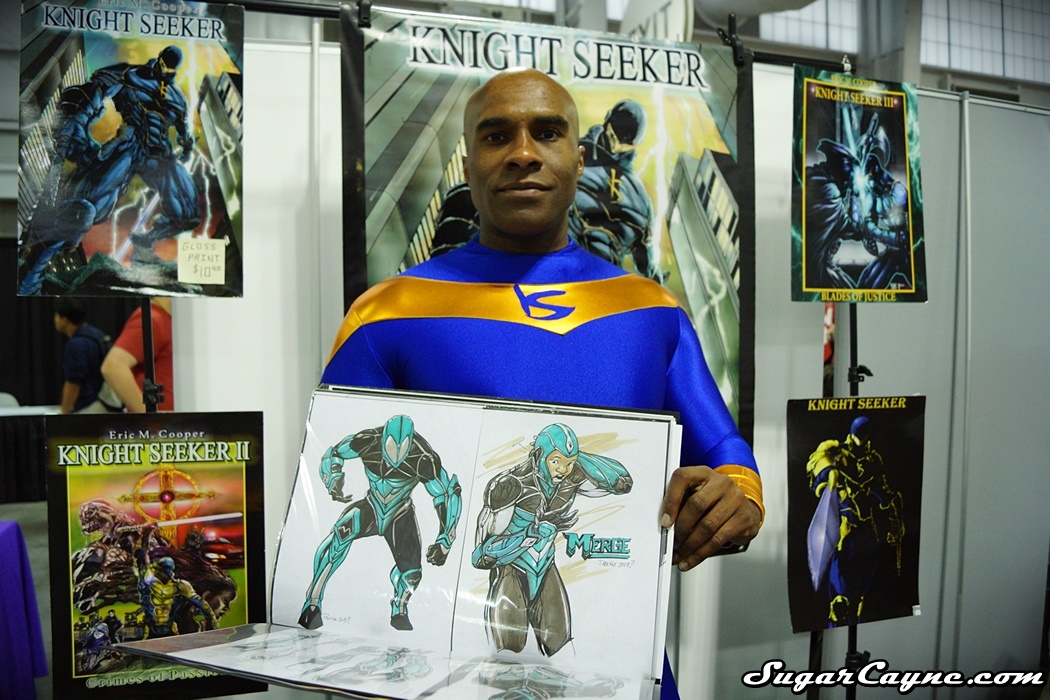 Super talented writer Eric Cooper was promoting his Knight Seeker movement at the 2014 New York Comic Con at the Jacob Javits Center in NYC! You know when Eric sets up shop at an event as big as the New York Comic Con he comes in full Knight Seeker cosplay mode! He was also promoting his new upcoming comic called “Merge”. He tells me some details on the Merge series in the video interview. Of Course Eric had some cool Knight Seeker apparel on display for folks to grab up. I was diggin the new colors his tees come in 4sho!