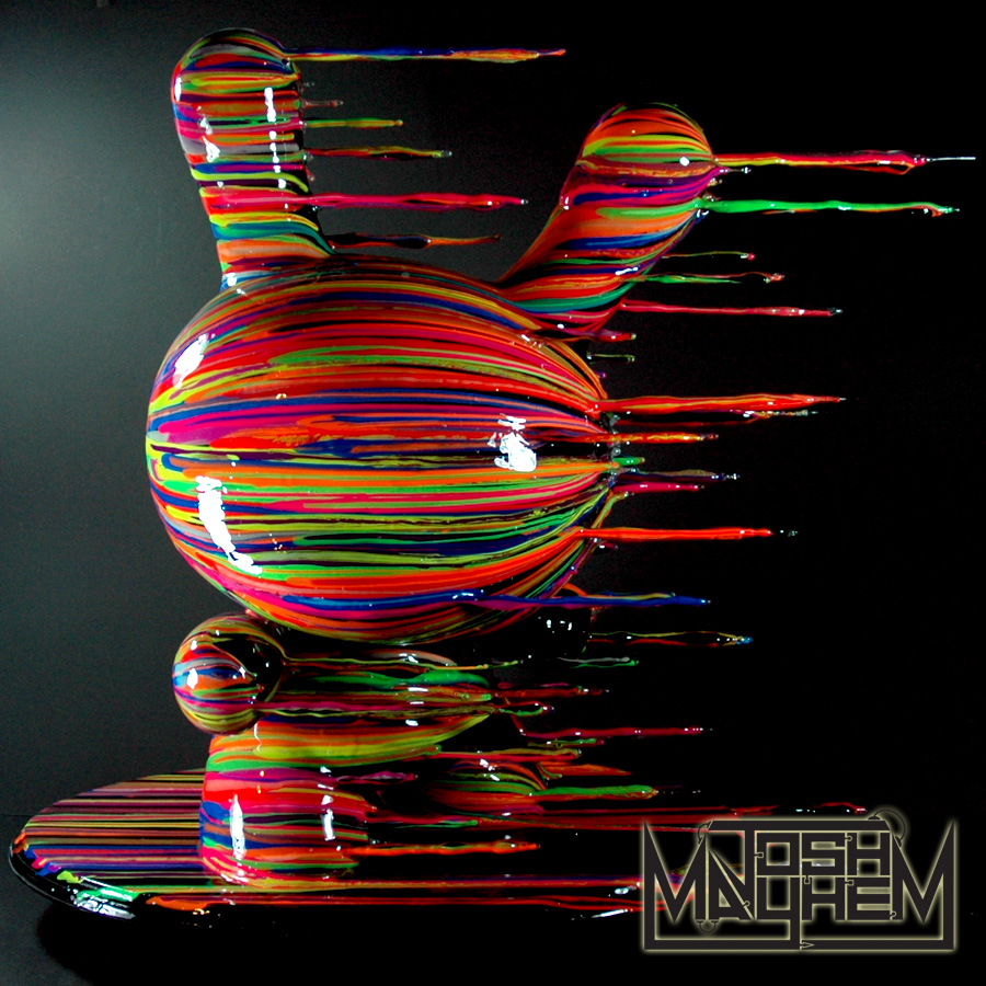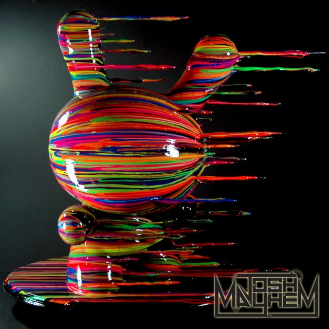 Custom toy designer Josh Mayhem made a sick 20″ Dunny masterpiece with his “Blown Away’ figure!! He designed this amazing piece for the “DTA Dunny Show,” set to take place at The Clutter Gallery and done in partnership with Kidrobot. The “Blown Away” figure features these amazing air streak formations and the coloration’s are done in UV reactive paint so it glows-in-the-dark as well….that’s sick!!!