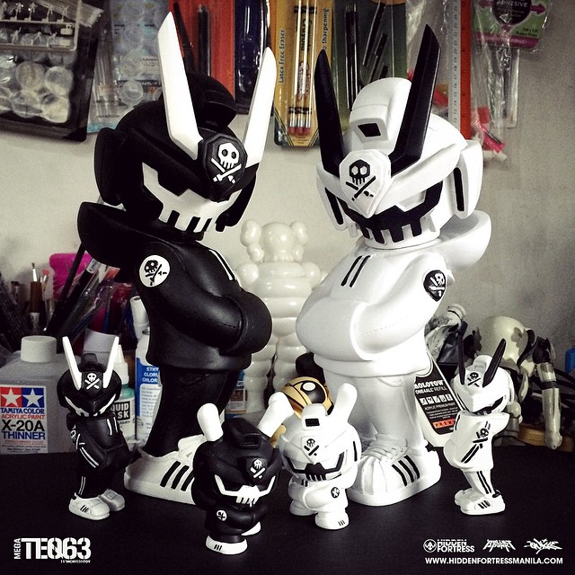 “Bulletpunk: MEGATEQ63” is an original toy concept that is sculpted, hand-painted and cast in high-quality resin individually by Quiccs Maiquez AKA “Quiccs”. The MEGATEQ series stands at a tall 11” and it’s not just a static figure, it actually has head articulation in the design. The head piece is so dope and when you look at it you don’t know if it’s a robot or just a kid with a helmet on. The hoodie and Adidas style sneakers give that HipHop flavor. MegaTEQ63 comes in “OG Fortress Black” and “Worldslayer White” colorways and each colorway is only Limited to 20 pieces for $75 each. There’s also an optional “YIN & YANG” Combo Pack option for both colorways for $140! Now the little figures you see in the image are the 3″ Baby TEQ63 and the 3.5″ TEQ63 which are sold separately and are just there to show you the difference in the sizes.