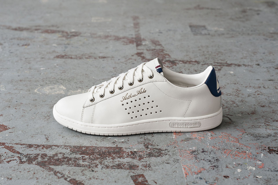 After French brand le coq sportif linked up with with Paris concept store colette to make the Arthur Ashe “Full White” , the folks at le coq sportif decided to release an Arthur Ashe model identical to the ’60s model that combines authenticity and modernity. The Arthur Ashe “Authentic” are all white premium leather signature tennis sneaker made in honor of the Iconic and Legendary tennis player. As part of the “Authentic” pack the le coq sportif sneaker, which originally launched in 1964, comes with some navy blue, bronze and red accents on the heel for a nice added touch. I love the way the signature Arthur Ashe logo placement on the side-panel matches the rivets and the little tri color accents on the the tongue are dope too, this is such a smooth sneaker
