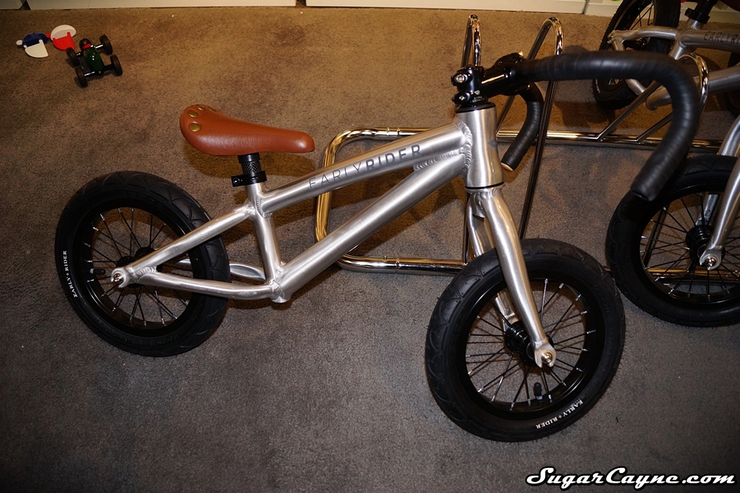 The next bikes we checked out were Early Rider’s awesome aluminum balance bikes the Road Runner and the Alley runner. They come with a polished finish on the frame, black components and nice brown leather seat. The front end of the bike is built to last with it’s industry standard features, you can basically put any of your favorite stems and bars on this bike if you want.