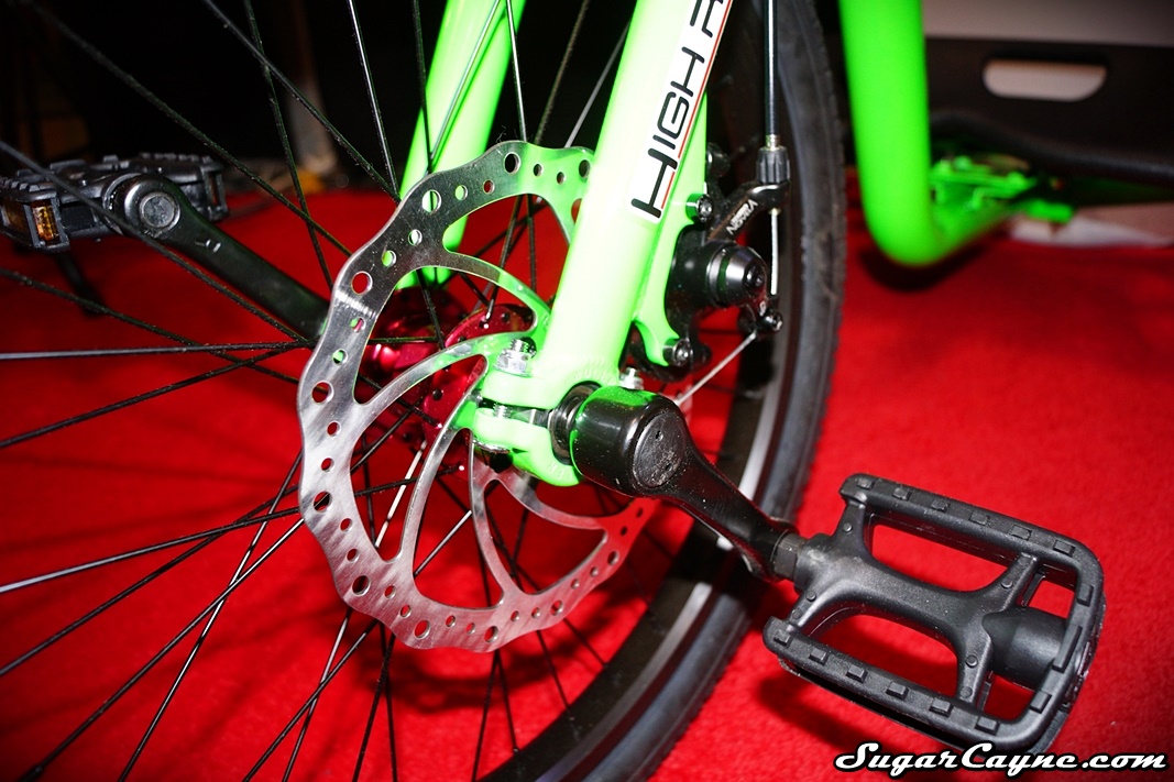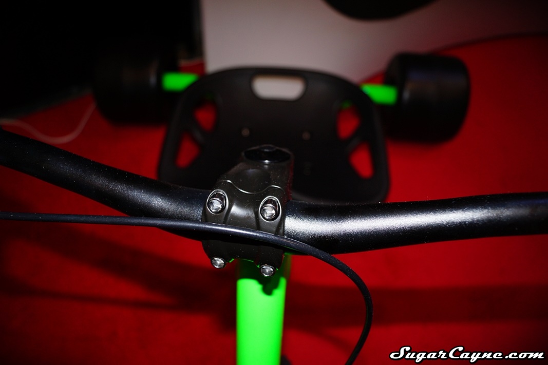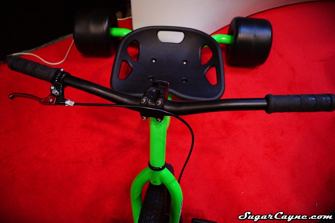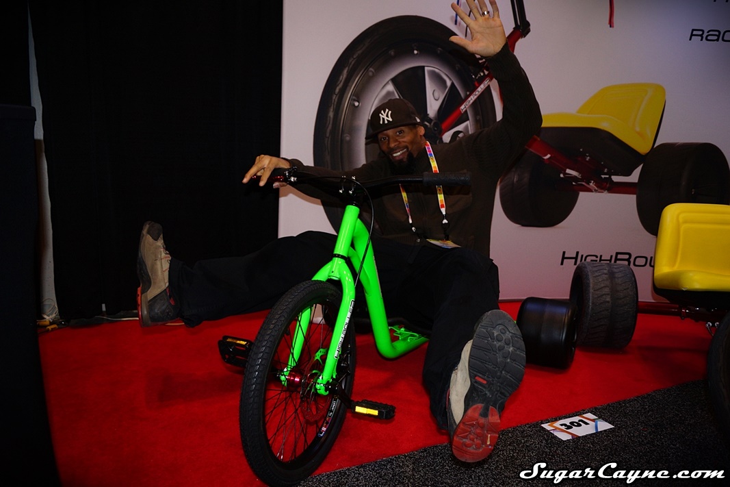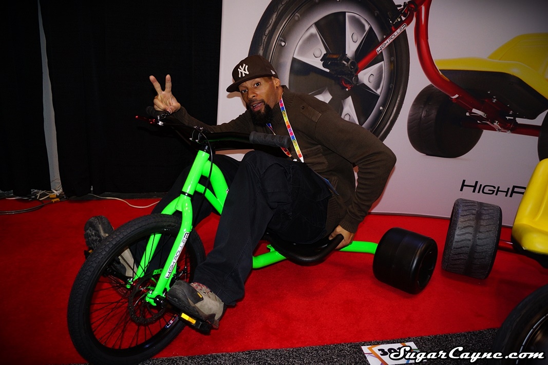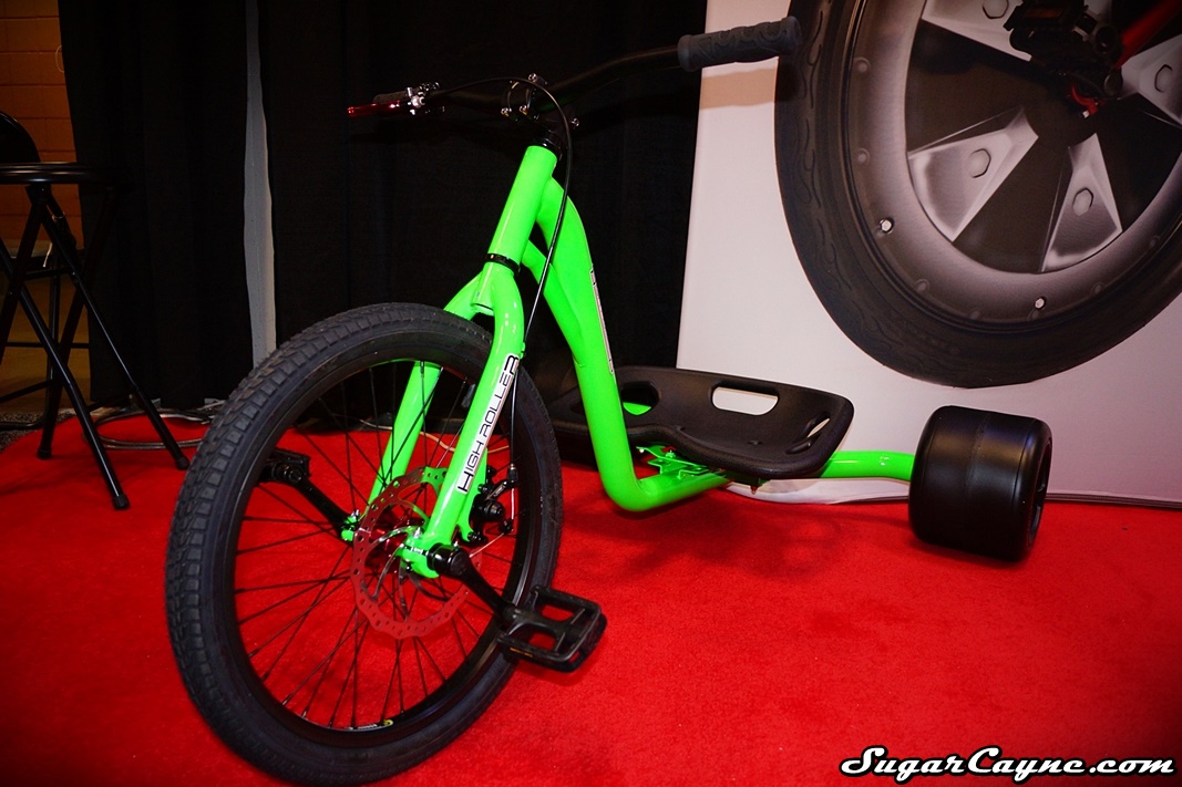 The High Roller USA crew was back at Toy Fair New York with their new down hill drift trike. It’s called the Straight Blade and it’s a low profile drifter with some really cool features. What I really like about the Straight Blade is the handlebars are basically MTB bars and the stem is industry standard threadless so you can put on your favorite BMX, MTB or just about any bicycle threadless stem on it. The custom front wheel uses the same specs as a 20″ wheel meaning you can throw on and 20″ BMX 36 spoke rim and spokes on this trike. Same deal with the pedals, you can put on any flat of clip pledals on the Straight Blade trike…..pretty cool!!