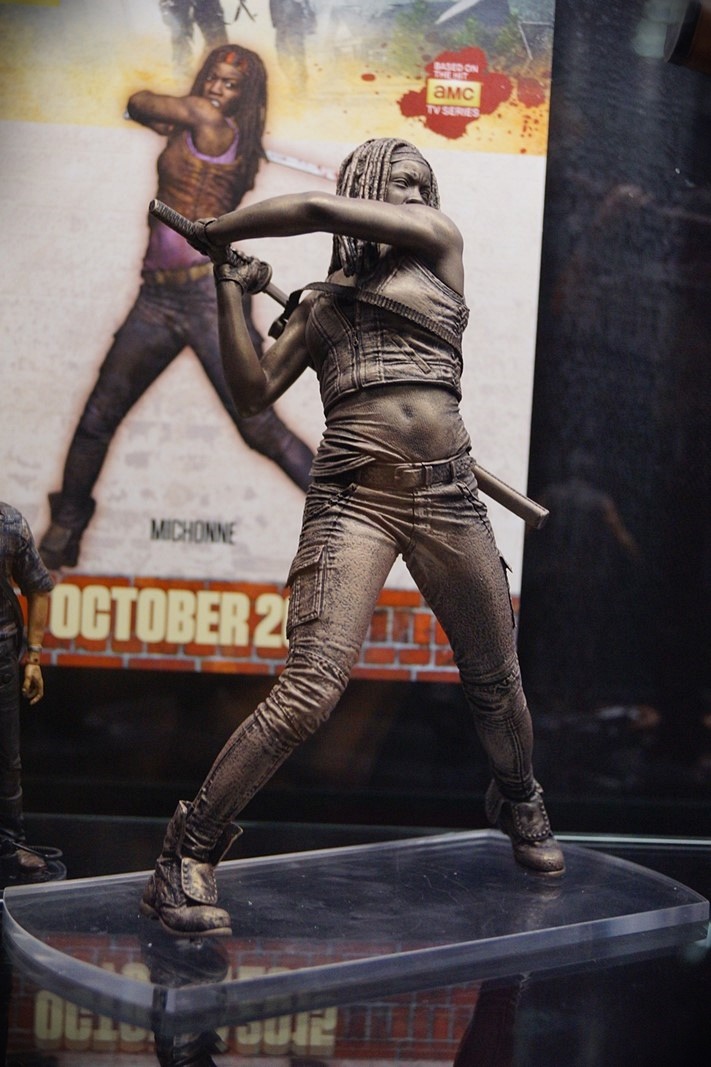 One of AMC’s The Walking Dead most popular characters Michonne has got the McFarlane Toys treatment with multiple different size figures in her likeness. I got to see these great pieces at the McFarlane Toys booth at Toy Fair NY. My favorite one is the prototype 10 inch deluxe Michonne action figure which debuted at the Toy Fair. I can’t wait to see the finished piece. Be on the lookout for this later on this year. I took some photos of the other Michonne figures on display at the McFarlane booth.